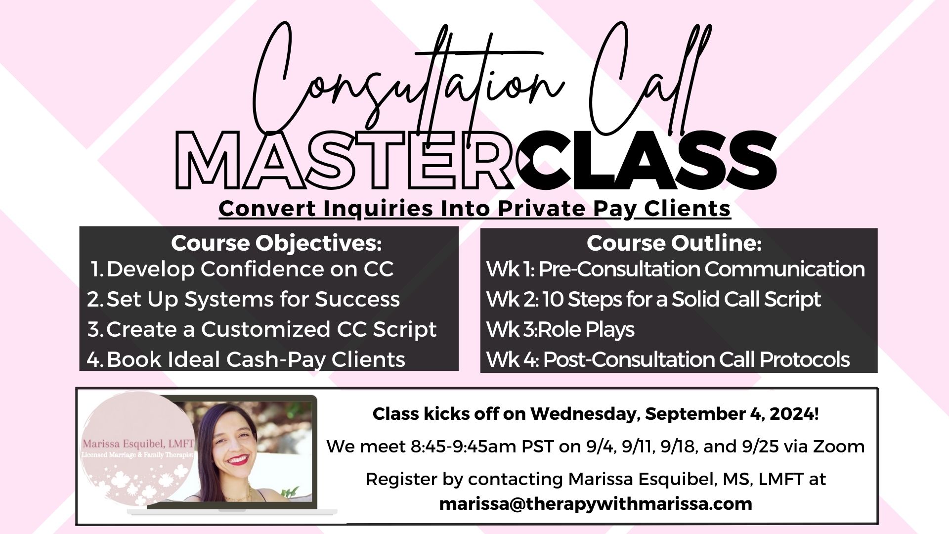 The class is for clinicians in private practice who want to convert inquiries into cash-pay clients.